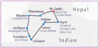 Der zweite Tag war ein sog. "Fahrtag". Die Straßen in Indien sind mit unseren nicht zu vergleichen. Oft geht es über "Stock und Stein". Alle paar hundert Meter müssen wir an einem "Sleeping Policeman" anhalten. Das sind zwei bis drei Betonschwellen quer über die Fahrbahn. Der Bus fuhr nur Schrittgeschwindigkeit. Dennoch ächzte und stöhnte das Gefährt. Unser Ziel war Mandawa. Hier gibt es in der kleinen Handelsstadt an der ehemaligen Seidenstraße zahlreiche palastartiger Häuser, sog. Havelis, die von 'betuchten' Händlern erbaut und bewohnt wurden.